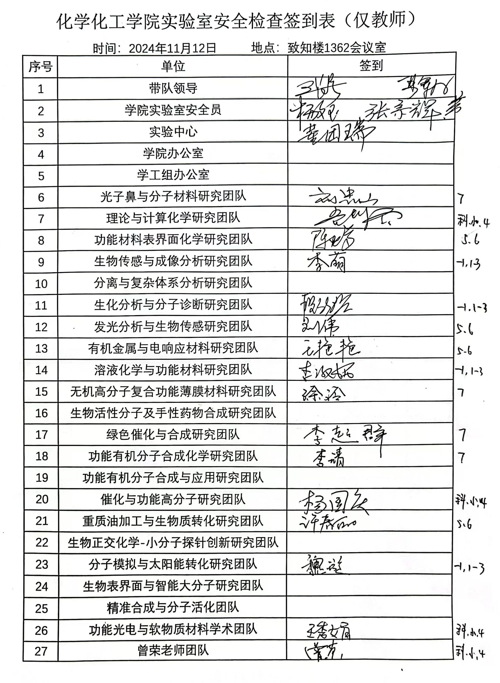 副院长王长号、应用表面与胶体化学教育部重点实验室副主任严军林、安全工作委员会副主任杨文玉、各科研团队教师代表和学生代表约30余人参加。王长号通报了楼层内消防缓冲区的改造情况,详细介绍了本次检查的内容和要求。严军林强调对科研助理和联培学生需要实验室安全培训,以保证所有进入实验室的人员具有安全意识和防护举措。杨文玉将日常安全检查的整体情况进行了反馈并提出改进意见。随后,各检查小组分别对致知楼、化工楼小三层、科研大楼的科研实验室、教学实验室、公共区域逐一进行检查。