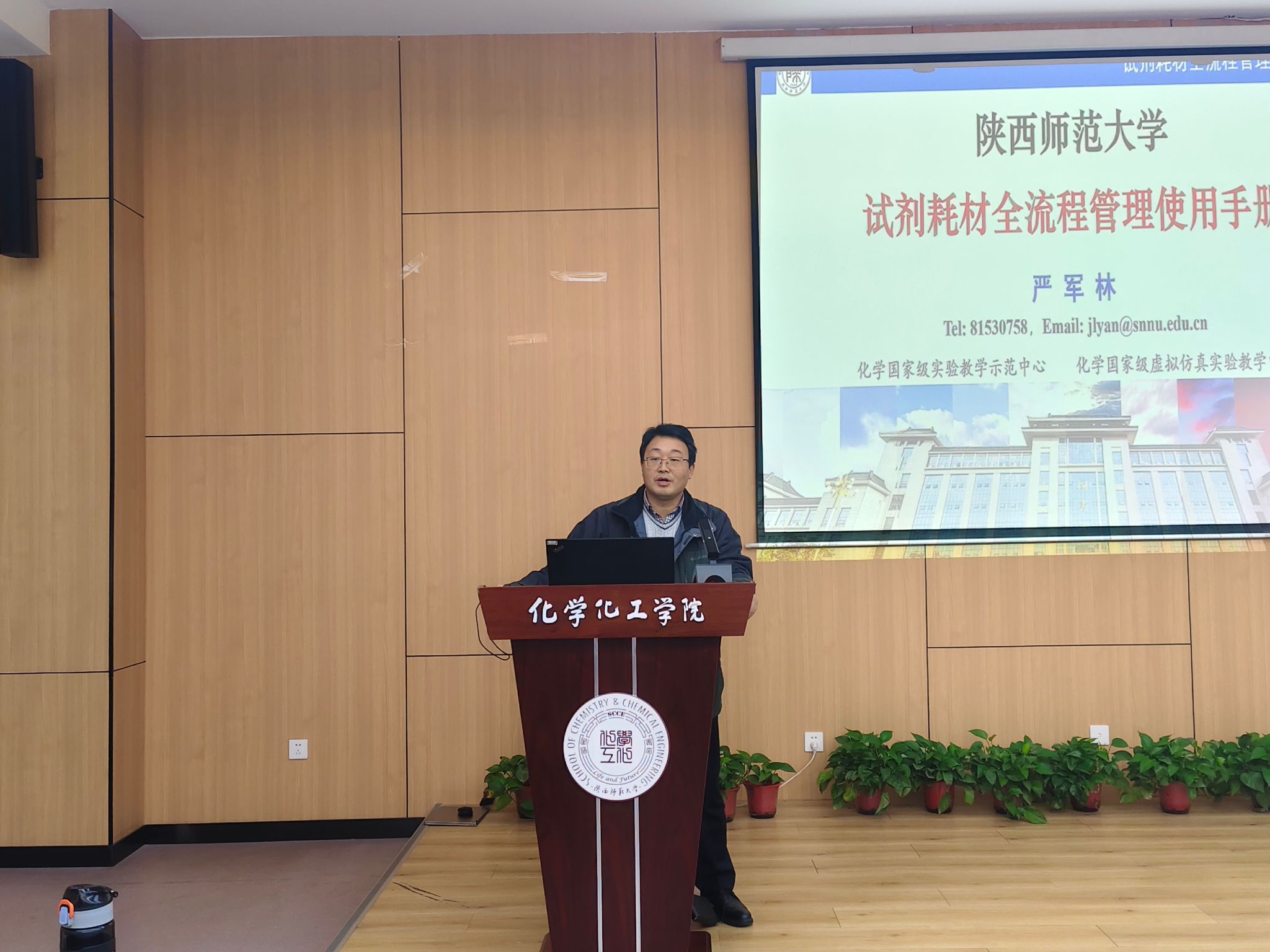 严军林讲解了危险化学品的全流程管理。他强调,对危险化学品从生产到废弃处理的全面、系统的管理和监督是实验室安全的重中之重。他分别从《危险化学品安全管理条例》要求,国家危险化学品目录,危险化学品采购、入库、存放、废弃处理等各个环节的注意事项和具体操作方法进行了详细讲解。