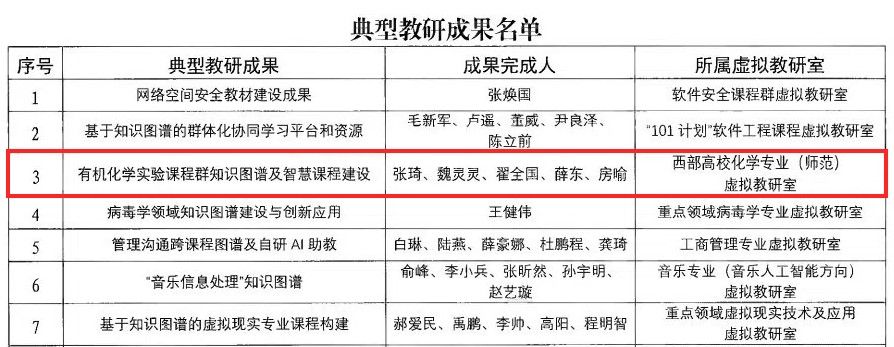 国家级“西部高校化学专业(师范)虚拟教研室”报送的“有机化学实验课程群知识图谱及智慧课程建设”项目(主要完成人:张琦、魏灵灵、翟全国、薛东、房喻)成功入选,荣获2024年度典型教研成果。