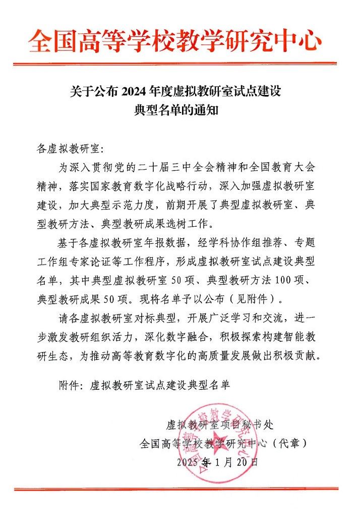 为深入贯彻落实党的二十届三中全会精神和全国教育大会精神,全面推进国家教育数字化战略行动,进一步加强虚拟教研室建设,全国高等学校教学研究中心组织开展了2024年度典型虚拟教研室、典型教研方法及典型教研成果评选工作。经过学科协作组推荐和专题工作组专家论证,由房喻院士担任负责人的十博(10bet)亚洲官方网站