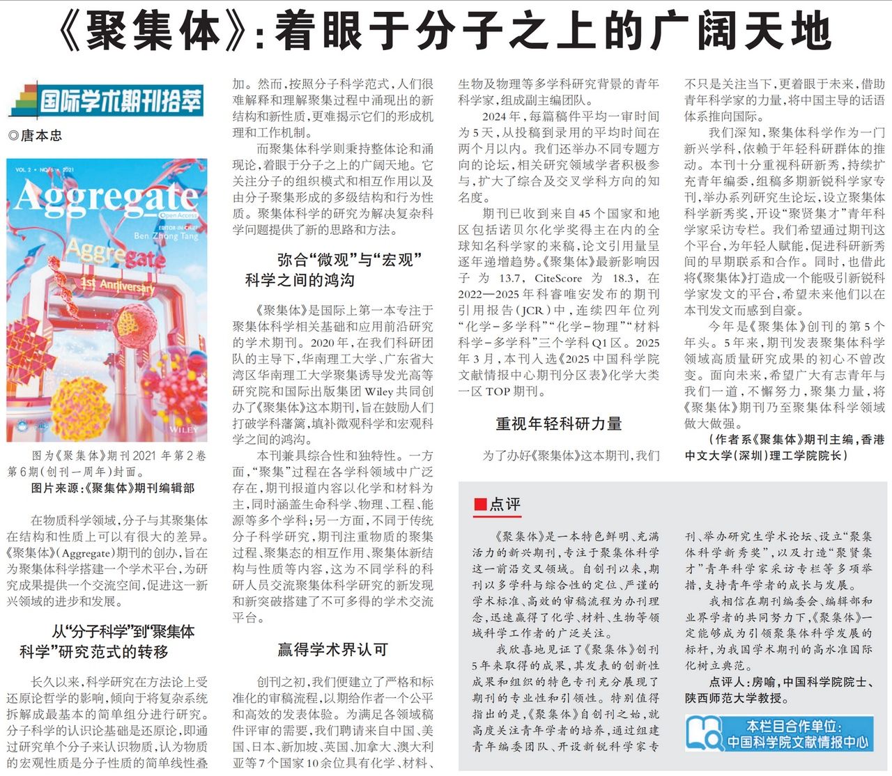 近日,房喻院士在《科技日报》上发表了对《聚集体》期刊的点评,全文如下: