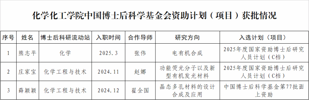 化学博士后科研流动站熊志平博士后、化学工程与技术博士后科研流动站庄家宝博士后获批2025年度国家资助博士后研究人员计划(C档),十博(10bet)亚洲官方网站