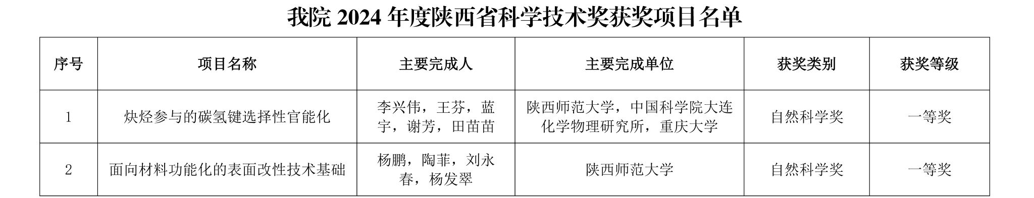 李兴伟教授团队的“炔烃参与的碳氢键选择性官能化”成果和杨鹏教授团队的“面向材料功能化的表面改性技术基础”成果获陕西省自然科学奖一等奖。这是近年来十博(10bet)亚洲官方网站