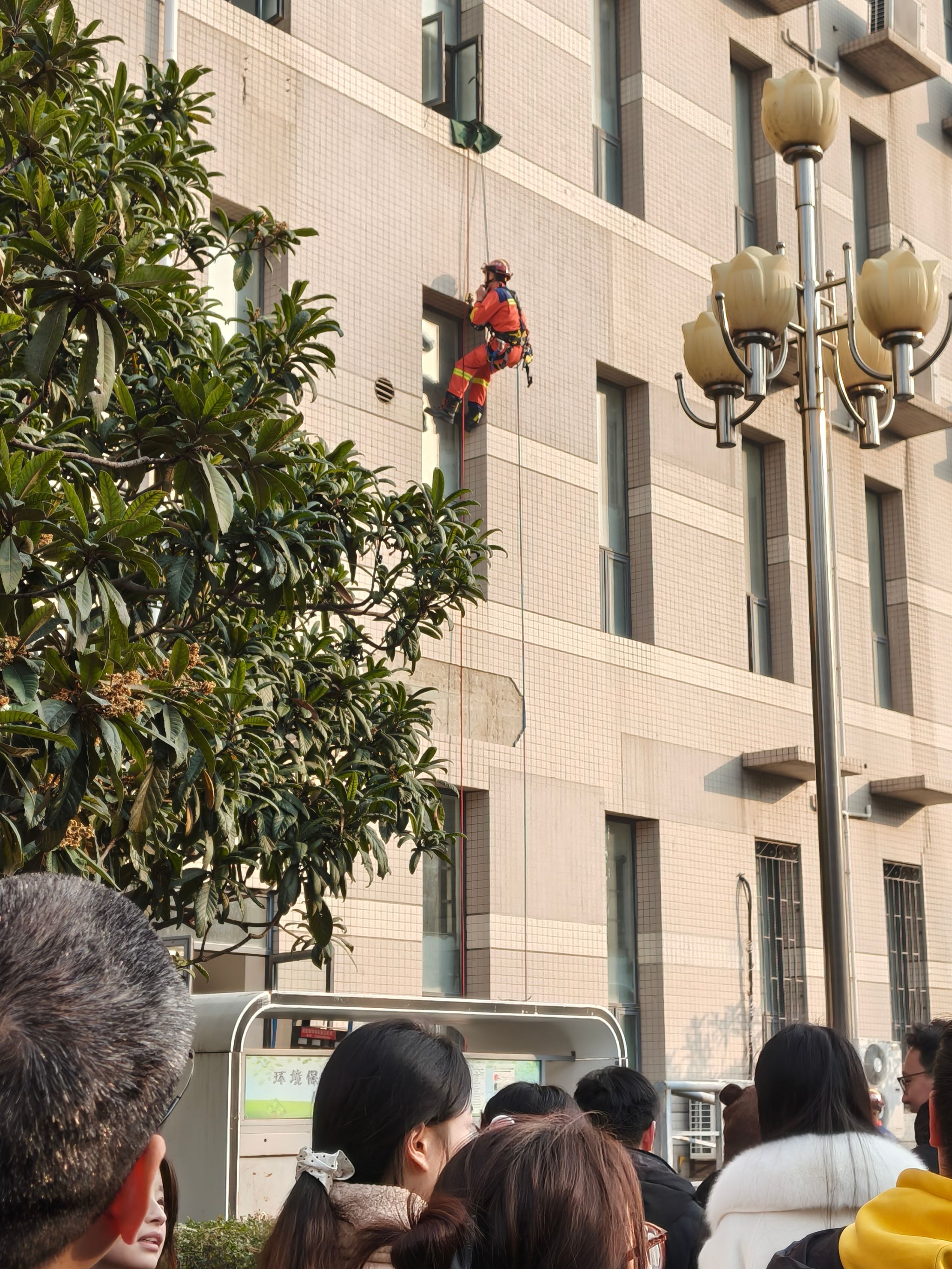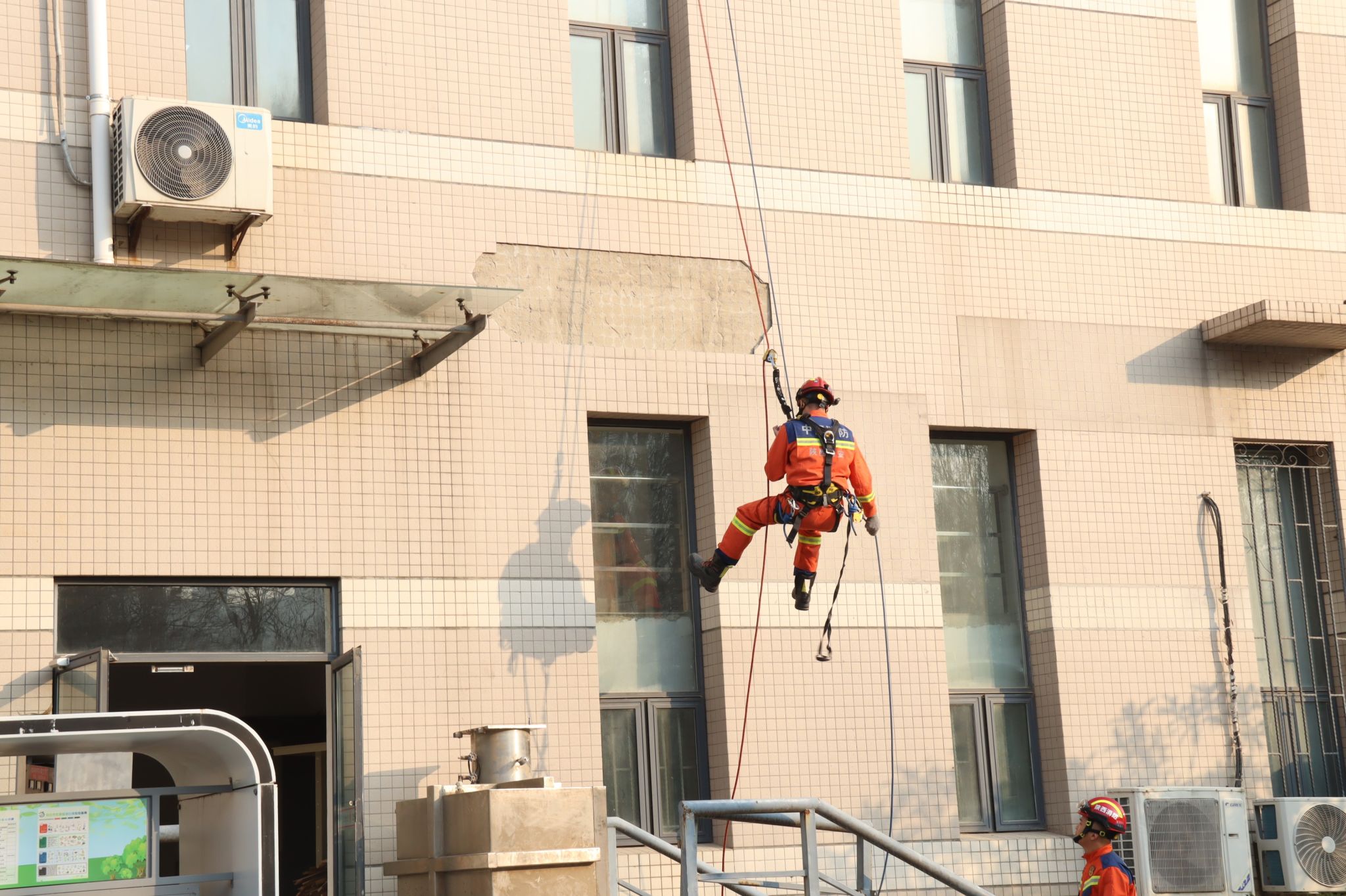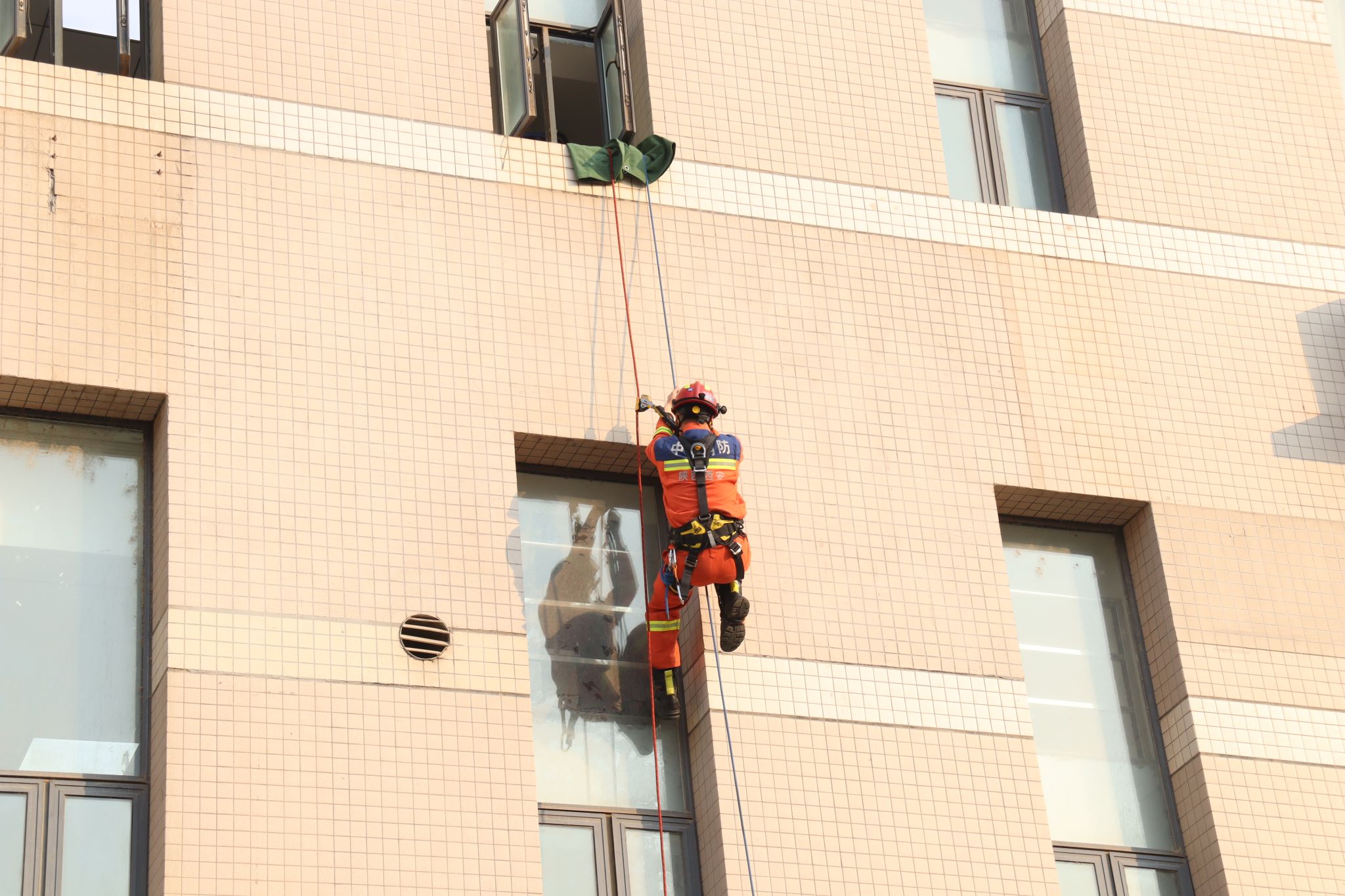 特别邀请长安区消防大队翰林南路消防救援站队员现场教学高空速降逃生技能。队员王杰详细讲解速降动作技术要领、安全绳锁使用方法及适用场景,示范员陈俊进行现场展示,为师生传授了专业实用的逃生知识,助力师生掌握保障生命安全的关键技能。