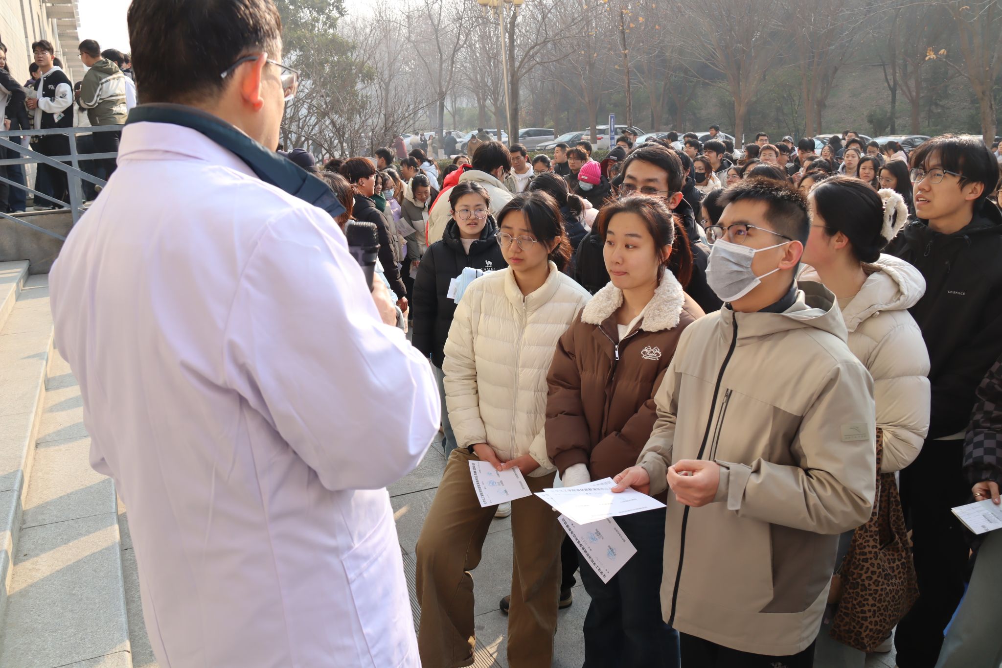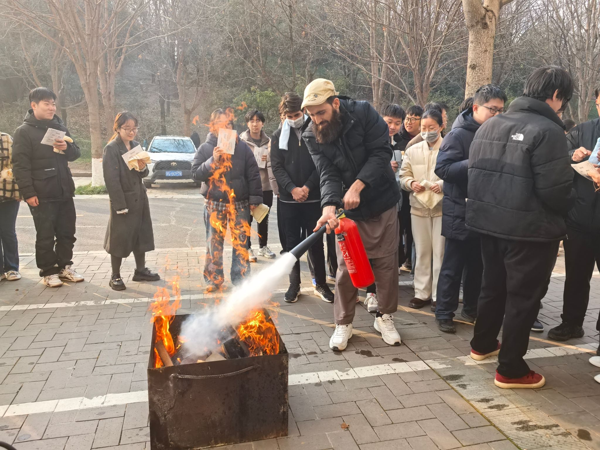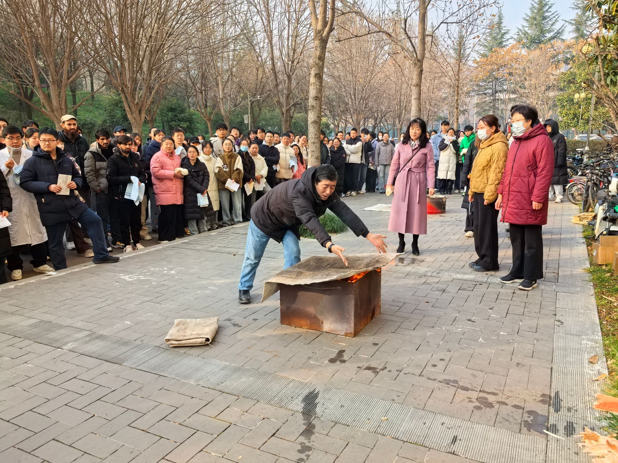 本次活动分阶段有序推进。上午7:00,工作人员在致知楼南门通过二维码精准统计入场人员,同步发放消防安全物资,为演练顺利开展奠定基础。9:30,总指挥肖新军发布应急疏散指令,各楼层迅速启动烟雾发生器并拉响警报,应急疏散环节全面展开,引导师生员工采取“打湿毛巾、捂住口鼻、弯腰靠右、有序下楼”的科学逃生方式撤离。整个疏散过程高效有序,仅用时4分53秒,共安全疏散人员818名。
