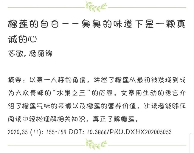 焦桓教授的指导下,2019级本科生苏敏、杨丽锦所撰写的科普文章《榴莲的自白——臭臭的味道下是一颗真诚的心》在2020年《大学化学》科普特刊正式发表。