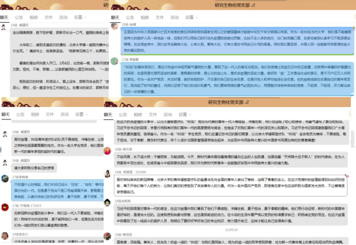 研究生有机党支部于3月19日线上组织了“学习习近平给北京大学援鄂医疗队全体“90后”党员的回信”主题党日活动。本次线上活动主要以群里文字交流形式展开。