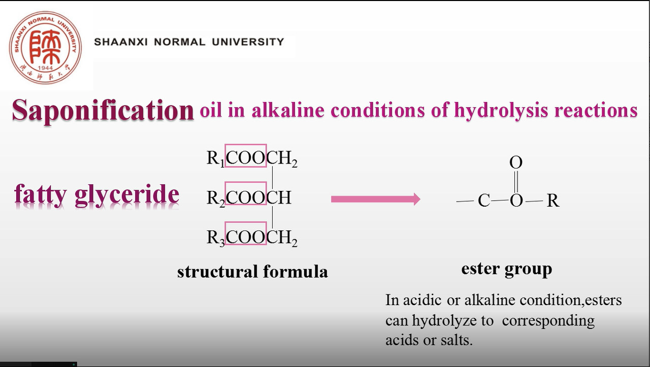 陈颖瑞同学制作的英文微课以《Saponification》为题,采用了贴近生活且难度适中的油脂的皂化反应为主题,以幽默、欢快的方式呈现知识,学生在了解皂化反应的同时,感受化学在实际生活中的重要存在,体验化学的魅力以及化学对生活的价值。