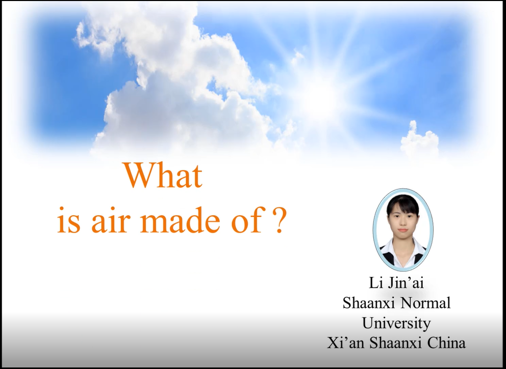 李金爱同学以《What is air made of?》为题,全英文讲解了空气的组成,生动形象地探究了空气组成的实验,整体内容完整且严谨。