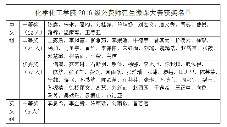 于2020年3月举行了2016级全体公费师范生参加的微课比赛。此次大赛分为中文组和英文组,分别从教学视频、多媒体课件与教学设计三个方面进行了评选,化学教学论教研室的教师从参赛的近200个参赛作品中评选出中文组一等奖12个,英文组一等奖5个,二等奖、优秀奖若干(获奖名单见文末)。以下是本次大赛评选出的优秀作品展示。