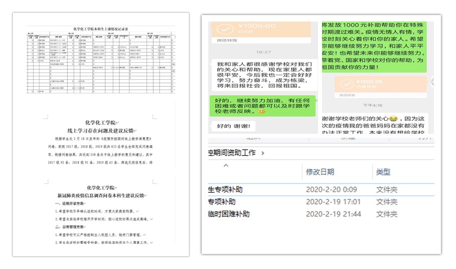落实资助关爱 解决学生实际困难。坚持隔离疫情不隔离爱的工作理念,积极关注家庭经济困难学生的学习、生活以及所在地区疫情发展情况。各年级辅导员通过QQ、微信、电话等方式,了解家庭经济困难学生的假期学习生活情况,特别注重对湖北籍困难学生的关心和慰问。配合学校资助中心对湖北籍困难学生进行专项资助,对因疫情无法复工造成家庭经济困难的学生开展临时补助,对因网络问题开展线上教学存在困难的学生提供线上教学流量专项补助。同时,注重对资助学生的爱国主义教育和感恩教育,引导受助学生努力学习,通过提升自己回报社会;动员受助学生积极参加学校组织的战“疫”志愿服务活动,鼓励学生在力所能及的范围内积极贡献自己的力量。