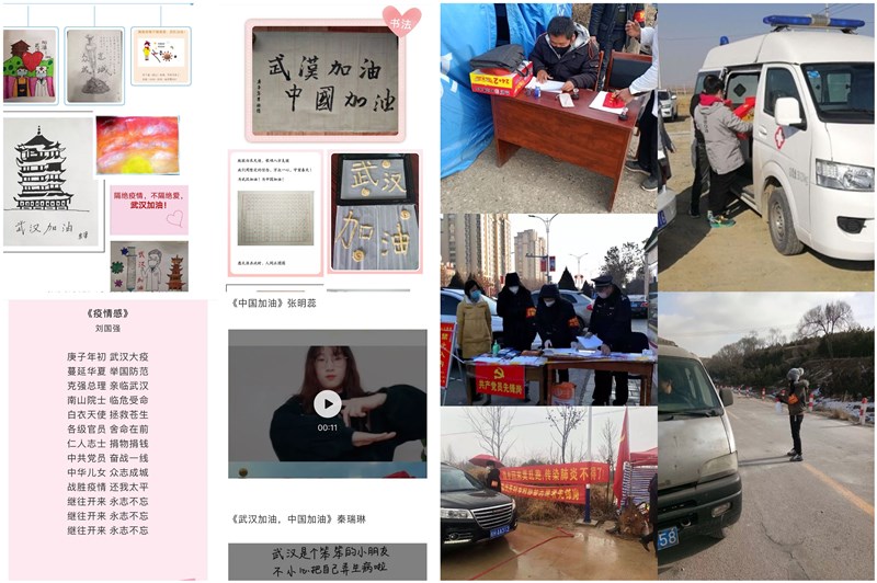 反馈湖北籍研究生的需求,提升工作的精准度;本科生第二党支部组织开展“抗击疫情 并肩同行”主题线上活动,学生党员们以书法、诗歌、朗诵、视频祝福等形式为武汉加油;四位共青团员主动向家庭所在地的社区和村报到,积极参与当地的疫情防控工作;十四位共青团员报名参与我校团委组织的战“疫”志愿服务工作,发挥专业特长在线为医护人员家庭提供志愿帮扶、助力社区疫情联防联控工作、为我校疫情防控人员子女提供线上教育帮扶。他们以实际行动报效祖国,服务社会,投身疫情防控第一线,为早日防控疫情获胜贡献自己的一份力量。