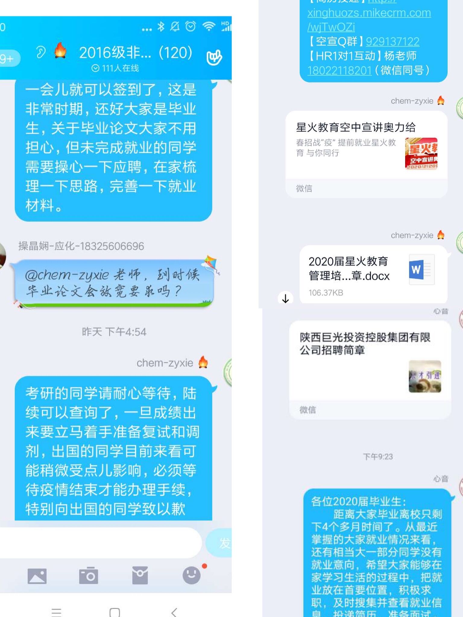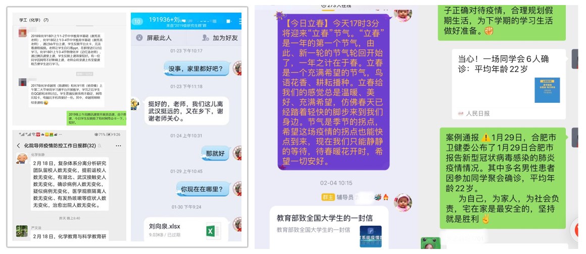 加强思想引领 筑牢学生防疫信心。各年级辅导员利用班级微信群、QQ群等开展网络宣传教育,推送防疫知识,提醒学生注意科学防疫,引导学生树立大局观念,增强自我防护能力,切实树立“在家中学习休息,就是为疫情防控做贡献”的意识;引导学生关注网络舆情,不造谣、不信谣、不传谣,做网络守法者,守护风清气正网络环境;号召同学们“每天及时报告个人状况”“不接到学校通知决不返校”“未经批准不得提前返校”;引导学生充分利用假期时间学习提升,并做好延学期间在家网络上课的准备;自开展线上教学工作以来,各辅导员深入班级课堂通过电话连线、群内讨论、问卷发放等方式,了解学生对在线教学工作的满意度,征集学生针对线上学习的意见建议,积极协助各部门解决学生集中反映的问题,帮助学生尽快适应网络教学。