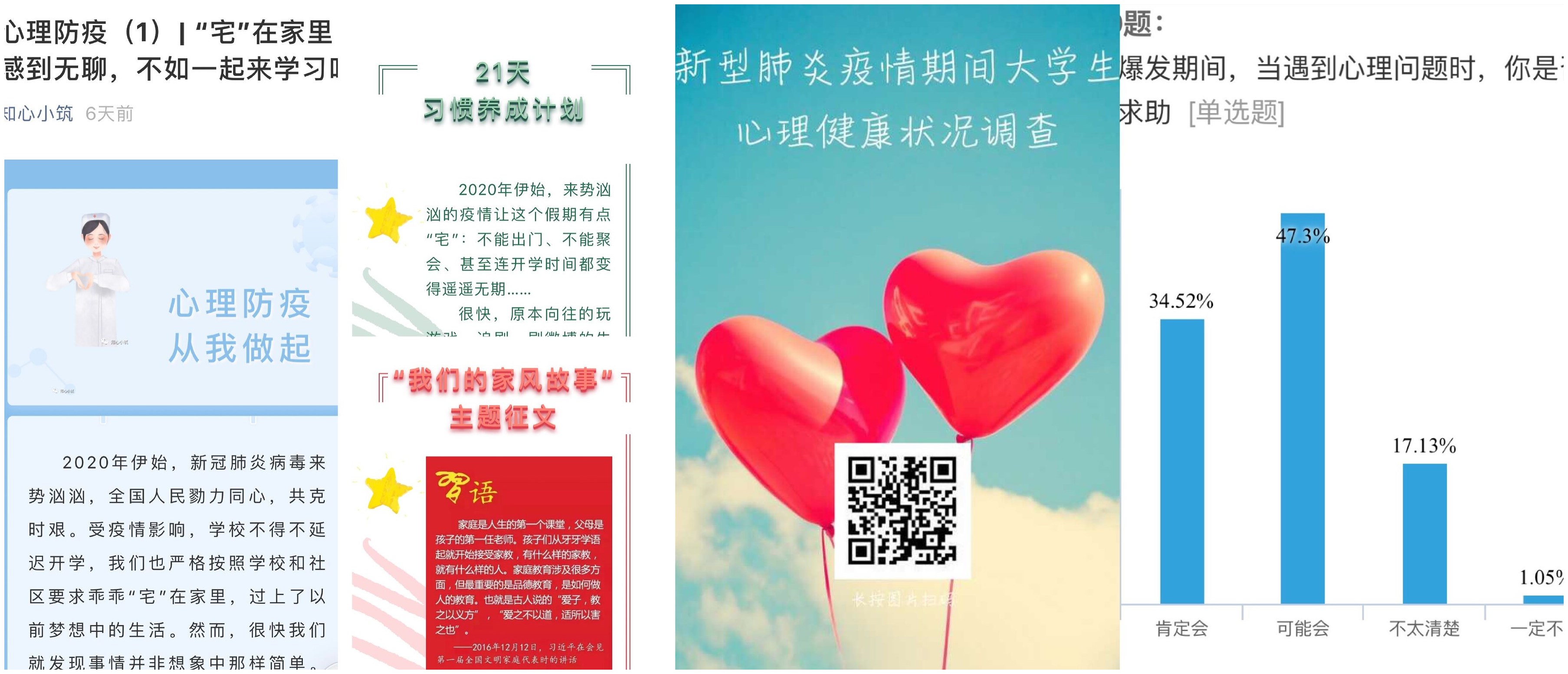 全体学生开展“新冠肺炎疫情爆发期间的心理健康”调查,撰写调研报告,总结疫情背景下大学生心理健康总体状况及行为特点,为学生的疫情防护教育和心理疏导工作提供参考。结合问卷调查结果,在微信平台推送“心理防疫”系列文章,指导学生科学认知、合理调适,以理性平和的心态积极应对危机事件。