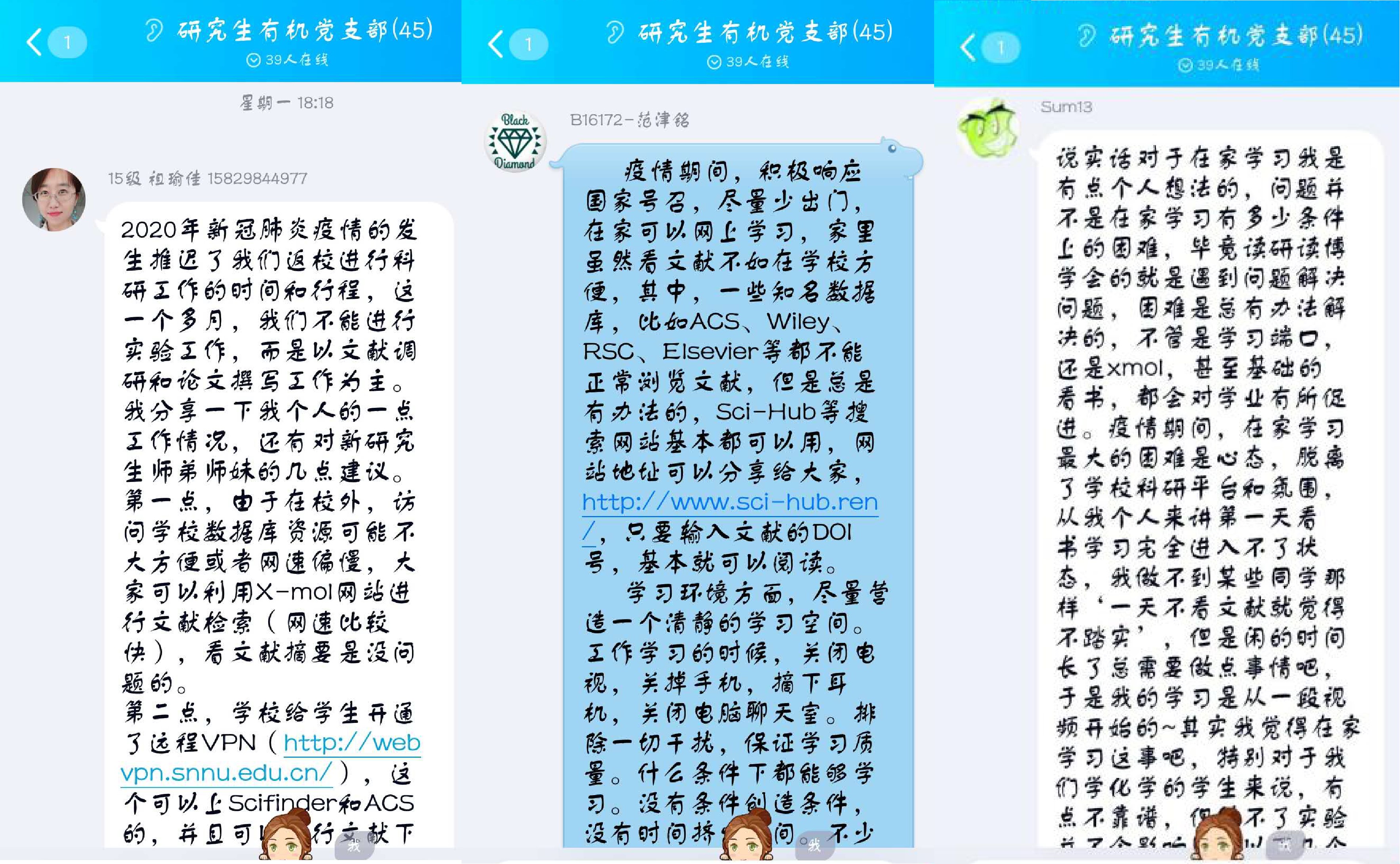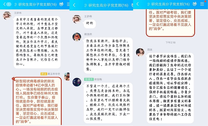 研究生化工党支部于3月7日通过QQ群开展线上主题党日活动。与会同志们采取文字聊天的方式在QQ群里就疫情防控期间的居家学习、毕业论文写作和如何开展就业进行了激烈的讨论。