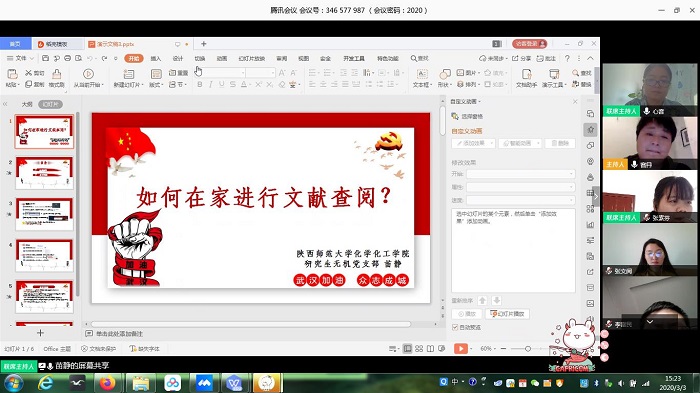 会上,支部书记陕勇通过网上材料和视频,向大家强调了推迟开学的必要性和重要性。湖北籍党员张素芬同志和非湖北籍党员张文阅同志向大家分享了湖北及自己家乡疫情的防控情况;疫情防控志愿者代表郭睿凤同志和马珍珍同志分享了自己在家乡疫情防控志愿工作的心得体会。博士生苗静同志详细讲解并演示了如何在家进行文献查阅;博士生王亚博分享了疫情防控期间研究生居家攻略和小贴士。