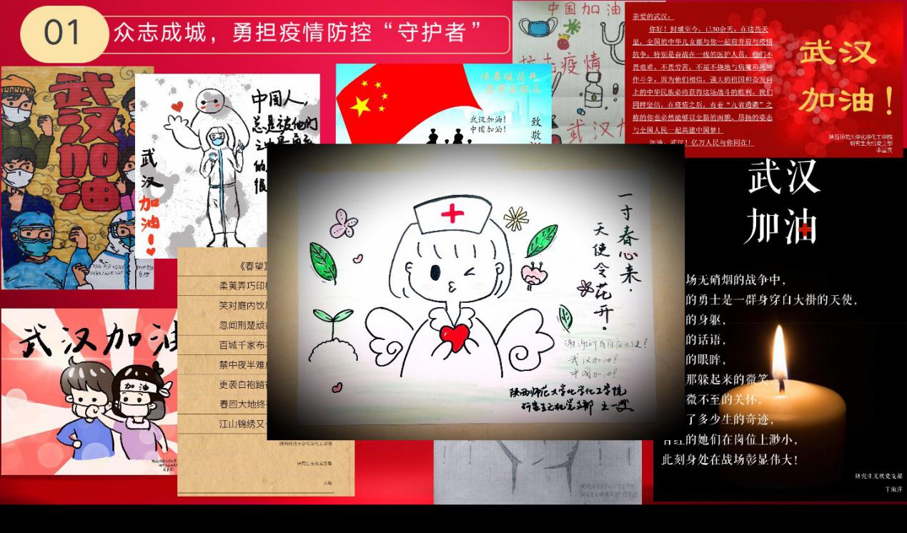 研究生党员们以实际行动践行初心、勇担使命。研究生党员们带头预防,率先垂范,以志愿者身份积极投身当地防控疫情的工作中,让党旗在防控疫情斗争第一线高高飘扬;积极地缴纳了特殊党费;结合疫情防控现状做出郑重承诺,用笔尖书写对社会的责任;用书法和漫画作品表达了为武汉加油,为中国加油;积极向党组织在线提交抗击新冠疫情思想汇报。