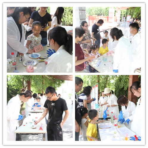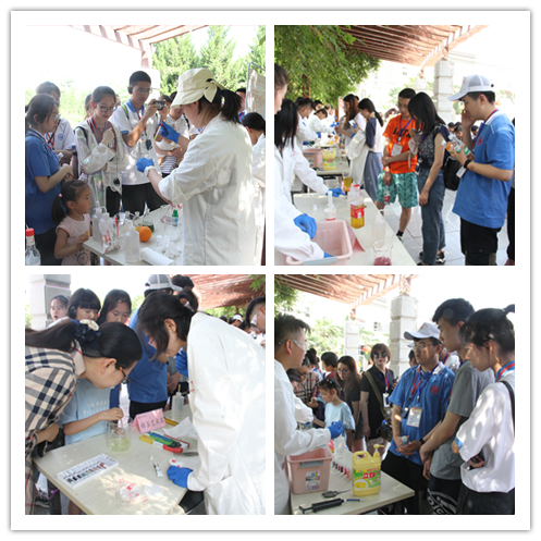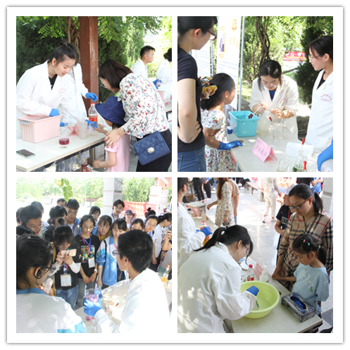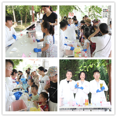 学生、来我校游学的中学生、师大社区群众等驻足观看,实验小组为观众带来包括动手拼装、展示讲解、实验演示等不同类型的18个化学元素相关活动,分别是:火山爆发、神奇的红茶、彩色雨滴等。现场观众在演示小组的指导下也尝试动手操作实验。来自商十博