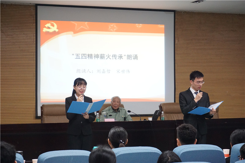 杨清源老师1950年参军,1951—1953年参加抗美援朝战争。立过功、评过先进,受到贺龙元帅及中央军委领导接见。后转业到陕西师大从事教学与领导工作,1990年退休后一直做关心下一代工作,曾多次被评为全国及陕西省教育系统先进个人。杨老虽已90岁高龄,但依然精神矍铄。报告中,杨老师采用大量详实的历史资料,围绕五四运动的起因经过、历史地位、精神内涵和新时代启示等方面做了深入讲解。报告中,学生们还通过主题朗诵、交流发言等形式表达自己对“五四精神”的纪念。