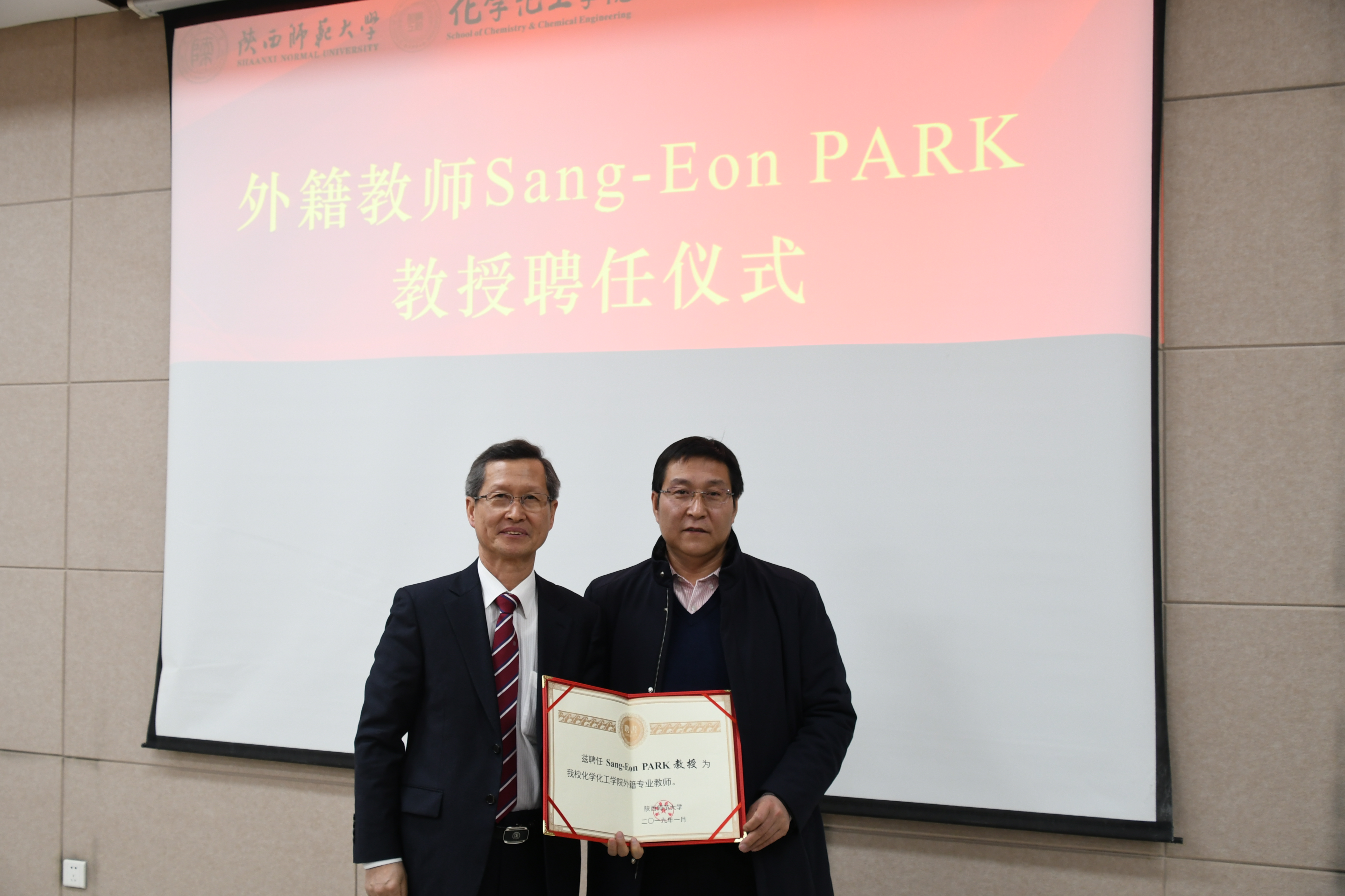 李磊代表学校对Sang-Eon Park教授的加盟表示衷心的感谢与欢迎。他谈到,Park教授加入陕西师范大学,推进了学校外籍教师相关制度的改革,具有重要的意义。希望Park教授的加盟为化学学科课程的建设注入新的理念。他也希望Park教授的到来能够帮助陕西师范大学培养和吸引更多优秀人才,促进国际化接轨,冲击世界一流学科。