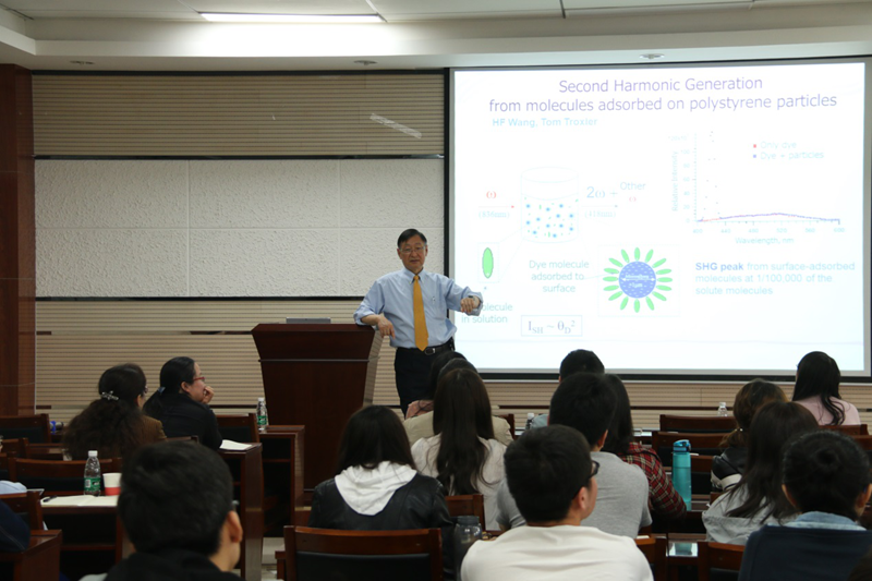 报告中,戴海龙教授介绍了二次谐波(Second Harmonic Generation,SHG)的发展历史、基本原理及在胶体颗粒表面以及生物方面的研究进展和应用,并就其课题组利用SHG研究分子在大肠杆菌细胞膜内的传输过程研究工作进行了详细解读。他讲到,利用SHG实验装置,在不借助别的研究手段的情况下,就可以量化小分子在活细胞膜中的传输速率。 此外,戴海龙教授还介绍了胶体颗粒表面非线性光学散射产生的物理机制,介绍了不同尺寸及不同基质纳米颗粒表面非线性光学散射信号的实验测量及产生机理过程,并介绍了其课题组最新发展的SHG光学成像手段研究了大肠杆菌多层生物膜中存在的分子传输现象。这对了解细胞膜表面的分子相互作用,包括吸附和转运,具有重要的生物学意义,同时也对某些中小尺寸的药物分子作用机理及药物分子释放机理的研究有重要意义。