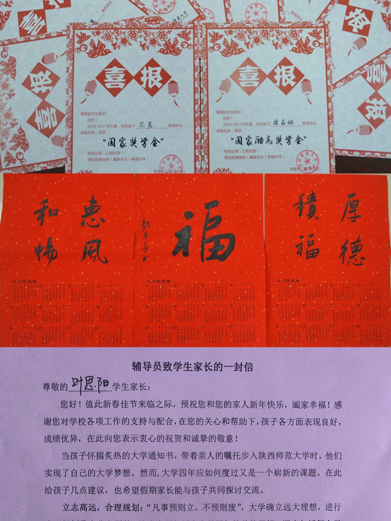 副书记王晓老师的组织带动下,学工组全体辅导员为2017年度荣获国家奖学金、国家励志奖学金、明德奖学金、叶圣陶奖学金、精锐奖学金、海亮奖学金等获奖学生撰写了喜报。在寄送喜报时,同时装入《辅导员致家长的一封信》和新春福字,向学生家庭表示新春佳节的问候,与家长分享学生在校成长的收获与喜悦,交流十博