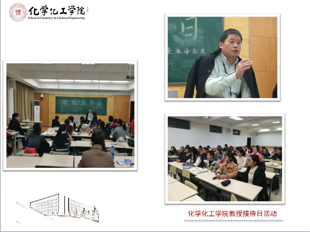 11月24日下午,柴永海教授应邀参加了2016级化学创新实验班的教授接待日活动。活动伊始,柴老师亲切地与同学们交谈。面对同学们提出的“本科专业学习方法”的问题,柴老师结合自身求学历程,阐明了自己对学习的认识并介绍了相应的学习方法。最后,同学们用热烈的掌声表明自己对柴教授的感谢。