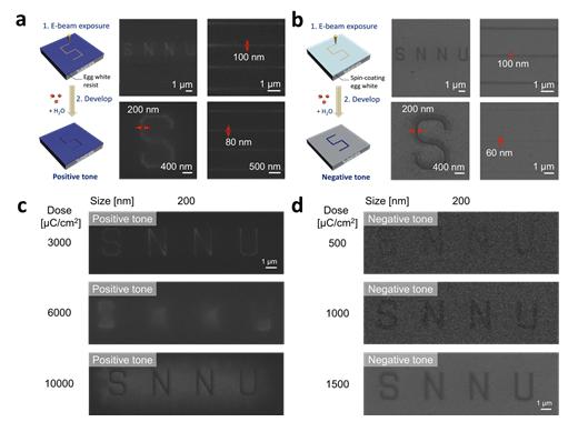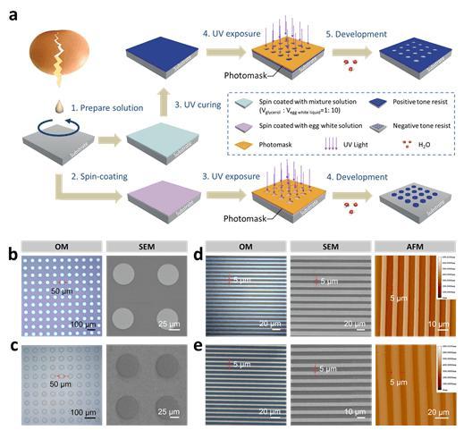 在国家自然科学基金委的支持下(51673112, 21374057, 51303100),蒋博静同学和杨鹏教授大胆假设,小心求证,从而开发了一种使用鸡蛋清制备的并且可用水显影的光刻胶。蒋博静等发现鸡蛋清具有对紫外光(UV)和电子束(EBL)辐照的双重敏感性,因此具有形成光刻胶的基本条件。与传统的光刻胶不同,基于鸡蛋清的光刻胶非常的便宜而且绿色环保,制备过程简单并且使用的都是无毒溶剂,从而为将该技术从实验室推广到大规模工业化应用提供了关键条件。