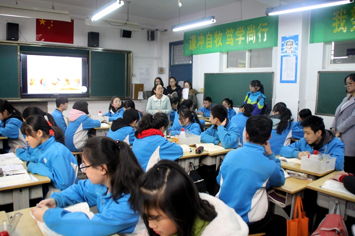 张蕾老师、辅导员李盼宁老师以及2015级卓越班全体同学参加了本次活动。大华中学教导主任郭健首先对各位老师和同学的到来表示热烈欢迎,随后,郭主任简短地介绍了大华中学的办学理念、办学特色及设施概况,让到场师生对大华中学有了整体上的认识。接着,在校方的安排下,师生们观摩了一节化学课——初三(1)班 “二氧化碳的性质和制法”。该课程讲授以学生自我探究为主,教师指导为辅。教师课前分发导学案,学生进行自主学习,课上结合实验进行探究,从而加深对知识的理解与掌握。