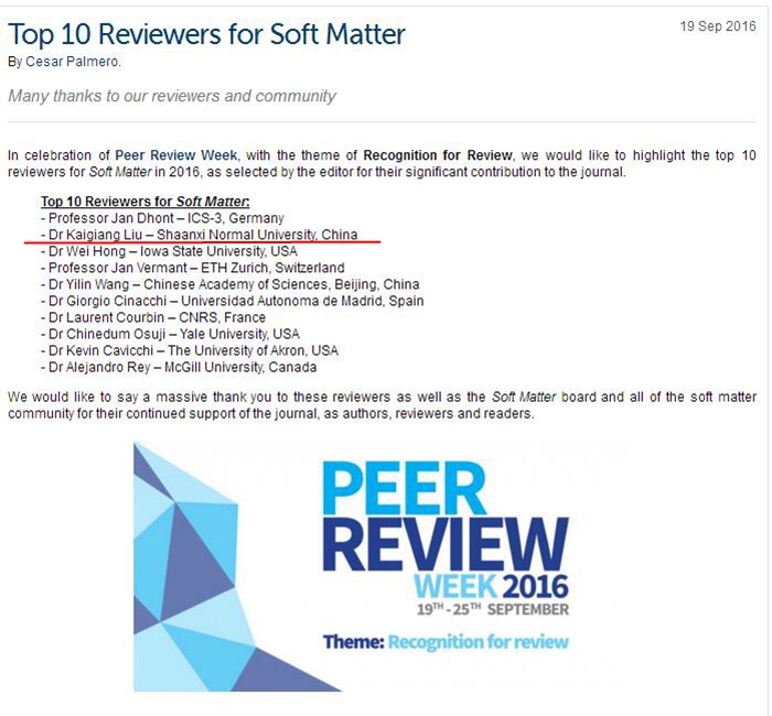 刘凯强博士荣获《Soft Matter》期刊十佳审稿人。