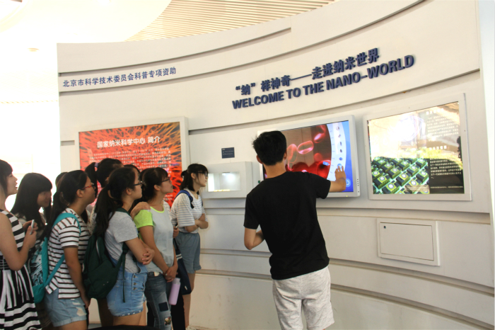 国家纳米科学中心。在苗力孝副研究员的引领下,同学们参观了我国纳米科学基础研究和应用基础研究的硅谷——国家纳米科学中心。苗老师用风趣的语言、通俗的文字给同学们介绍了锂电池的设计制作原理、充放电核心技术等,并一一展示了制作高精密度、高性能锂电池的尖端技术与加工设备。随后,在纳米所的科普知识展示大厅中,工作人员给同学们介绍了纳米材料的概念和原理、现有的应用技术和未来发展方向,并且对研发制作纳米材料所需的仪器及技术进行了讲解。笃学班的同学们也充分利用这一机会,结合自身所学,积极向老师们请教。参观结束,纳米中心的工作人员给同学们赠送了科普书籍与光盘供同学们进一步学习。