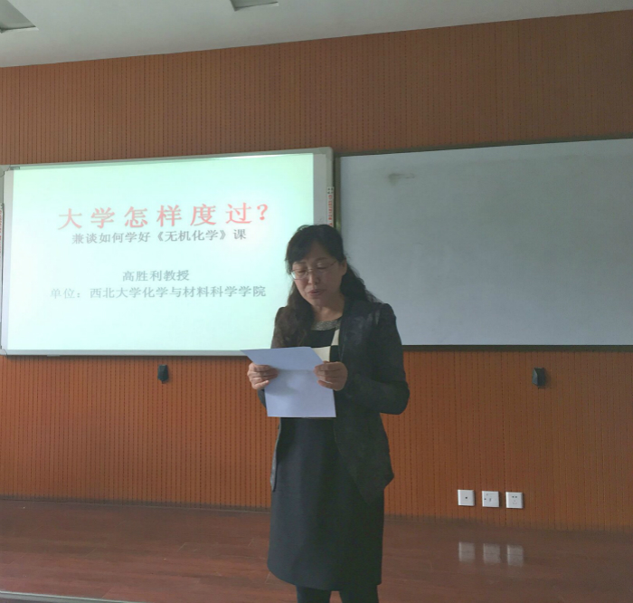高胜利教授受邀在雁塔校区4101教室作了题为“大学生活应如何度过,兼谈怎样学好《无机化学》课”的精彩报告。报告由陈亚芍教授主持,刘志宏教授、蒋育澄教授、马艺副教授,以及化学卓越班、化学一班、二班的全体同学聆听了此次报告。