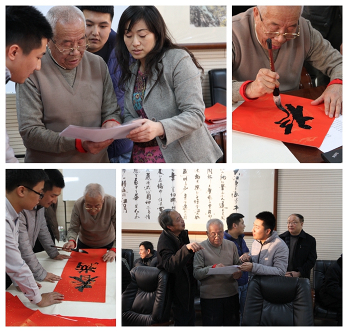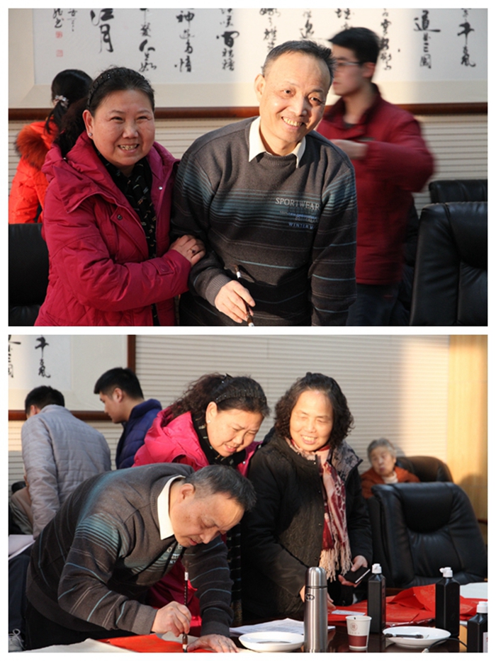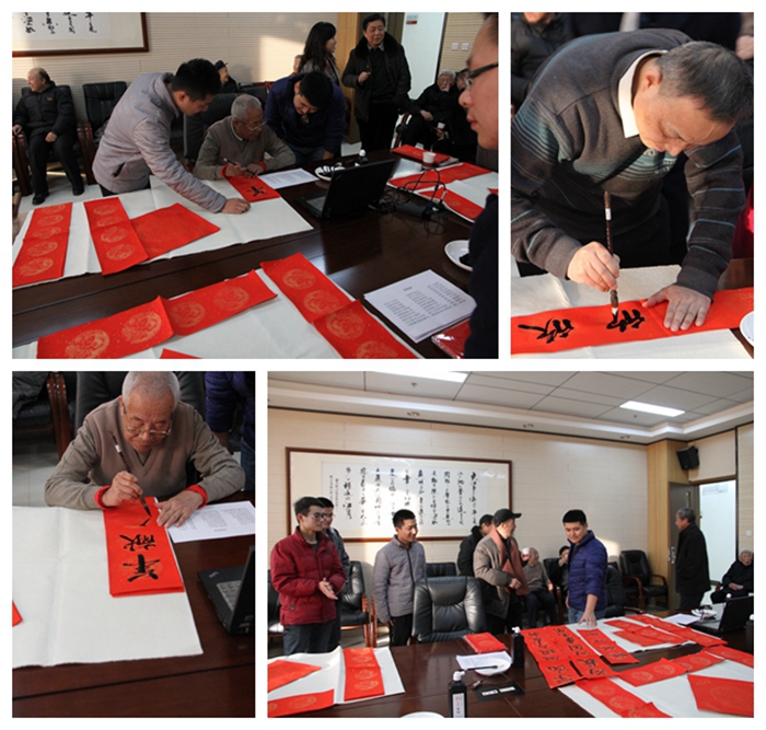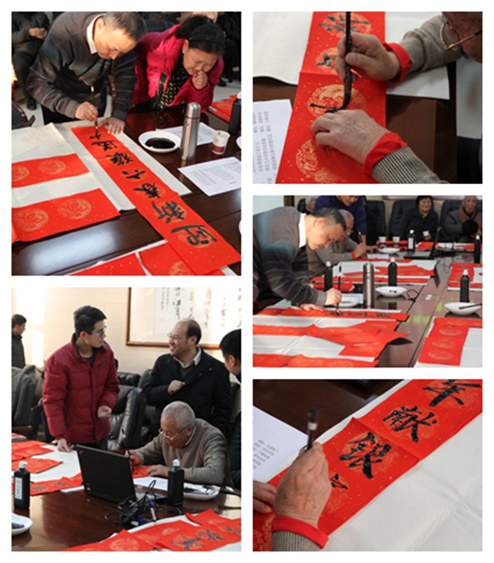 的祝福和对全院在职教工的勉励,还在1362会议室开展了“写春联·送祝福”活动。退休教师中的书法爱好者们现场挥毫泼墨,以饱满的热情创作出了一幅幅喜庆吉祥的春联,一个个苍劲灵动的书法字体落在喜气洋洋的红纸上,引得前来求取春联的在职教工们连连叫好,一副副带着浓浓墨香、饱含深深情谊、蕴藏美好祝愿的春联被大家争相领走。退休教师们顾不上休息,不停地挥舞手中毛笔为大家创作喜庆吉祥的春联,在职教师们也热心地为他们铺纸、添墨,大家都沉浸在祥和、愉悦的氛围之中。全体化学人将在这喜庆的新年气氛中继续保持旺盛的斗志和务实创新的作风,精诚团结,发奋工作,确保“十三五”建设开好局,为再续新的辉煌起好步!