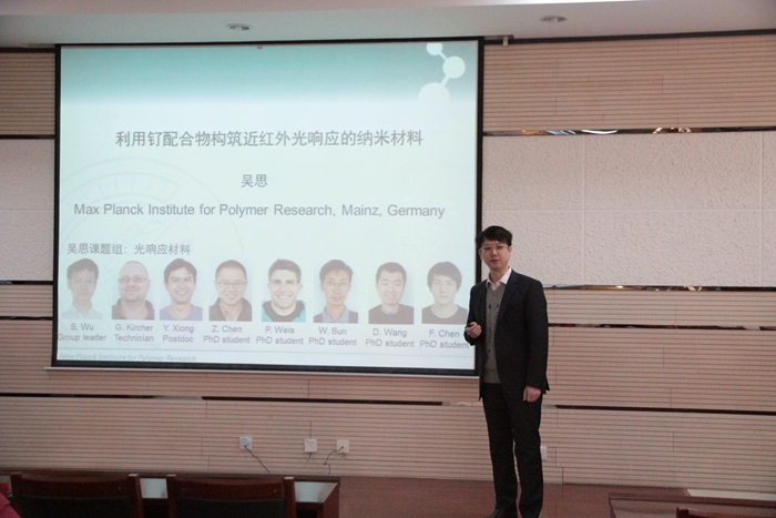 12月24日上午,德国马普所吴思博士受邀在致知楼1668报告厅为十博(10bet)亚洲官方网站 师生作了一场题为“利用钌配合物构筑近红外光响应的纳米材料”的精彩报告,报告会由杨鹏教授主持,西北工业大学田威教授,十博(10bet)亚洲官方网站 江金强教授、刘凯强副研究员等教师及相关专业研究生聆听了报告。