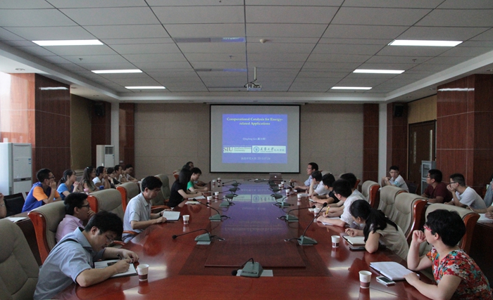 葛教授首先介绍了美国南伊利诺斯大学的概况,并由CO2催化转化为液态燃料和高附加值化学品的意义谈起,介绍了其课题组关于活性CO2在以In2O3为基础的系列氧化物体系表面吸附的DFT计算工作。王丽昌教授着重介绍了其研究小组在有机材料激发光谱方面的研究工作,通过采用不同官能团和共振态有机染料可以产生出长寿命激发态的激发光谱。会后,在场教师与两位教授展开了深入而热烈的讨论交流,增进了双方的相互了解。