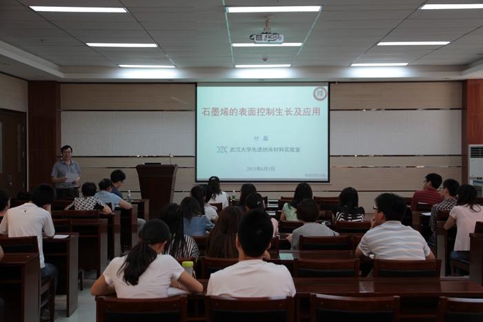 报告中,付磊教授用凝练简洁的语言向在场师生介绍了石墨烯的发现、发展以及石墨烯的潜在应用。他通过一些精彩的工作回顾介绍了其课题组近年在单层石墨烯控制生长方面所取得的进展和成果,并阐明了单层石墨烯应用于电池电极具有优势的原因。付老师通过将固体金属转化为液态合金金属基底发展出一系列制备单层石墨烯的新方法,并通过简单的高分子模板将单层石墨烯与金属基底成功剥离。最后,付磊教授通过一张张生动美丽的照片向我校师生展示了武汉大学的人文美景以及学术氛围,并希望在座的本科生及研究生积极前往武汉大学继续深造。付磊教授的报告深入浅出、内容丰富、逻辑性强,引起了与会师生的强烈共鸣。