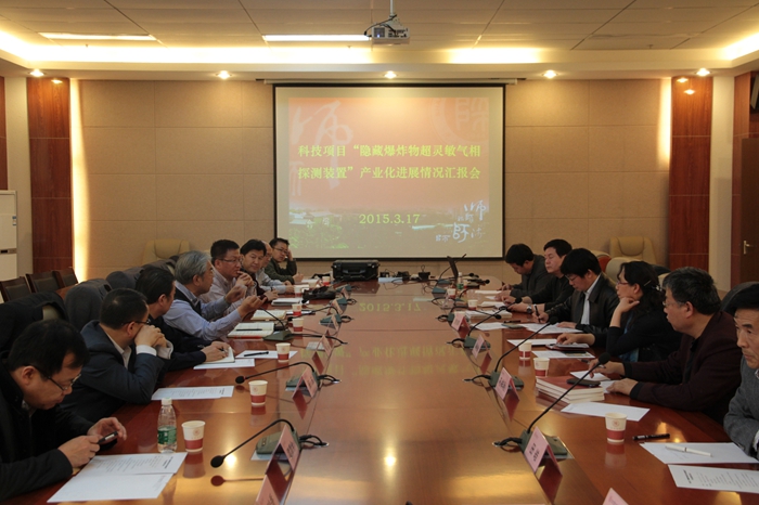 副院长辛云宏,科技处处长吴晓军、副处长张卫兵,南方办事处主任闫永昌,宣传部部长孔祥利参加了会议。会议由马进福主持。 蔡文斌首先从“隐藏爆炸物超灵敏探测装置”的生产背景、生产过程、市场价值、企业未来发展方向等几个方面系统地汇报了该项目的生产情况,随后向与会人员展示了产品。