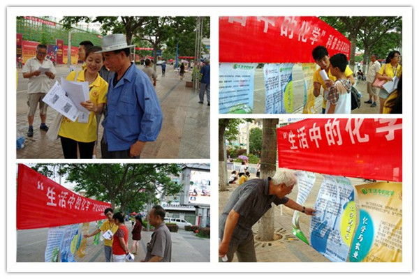 7月9日,宣讲团在陇州广场设外展进行“生活中的化学”科普知识宣讲。宣讲团成员首先联系城管部门确定了宣讲场地,并得到了城管人员的大力支持与配合;随后,团队所有成员精心布置场地、悬挂横幅、张贴宣传海报;待一切准备工作就绪后,实践队员开始从贴近百姓生活的日常问题入手,结合海报上的图片和文字资料给前来了解的现场群众进行详细讲解。此外,团队成员还给广场上的群众发放了宣传材料,介绍并邀请群众扫描“生活中的化学”官方微博二维码,以期让更多的人们了解化学与人类衣食住行的密切联系。