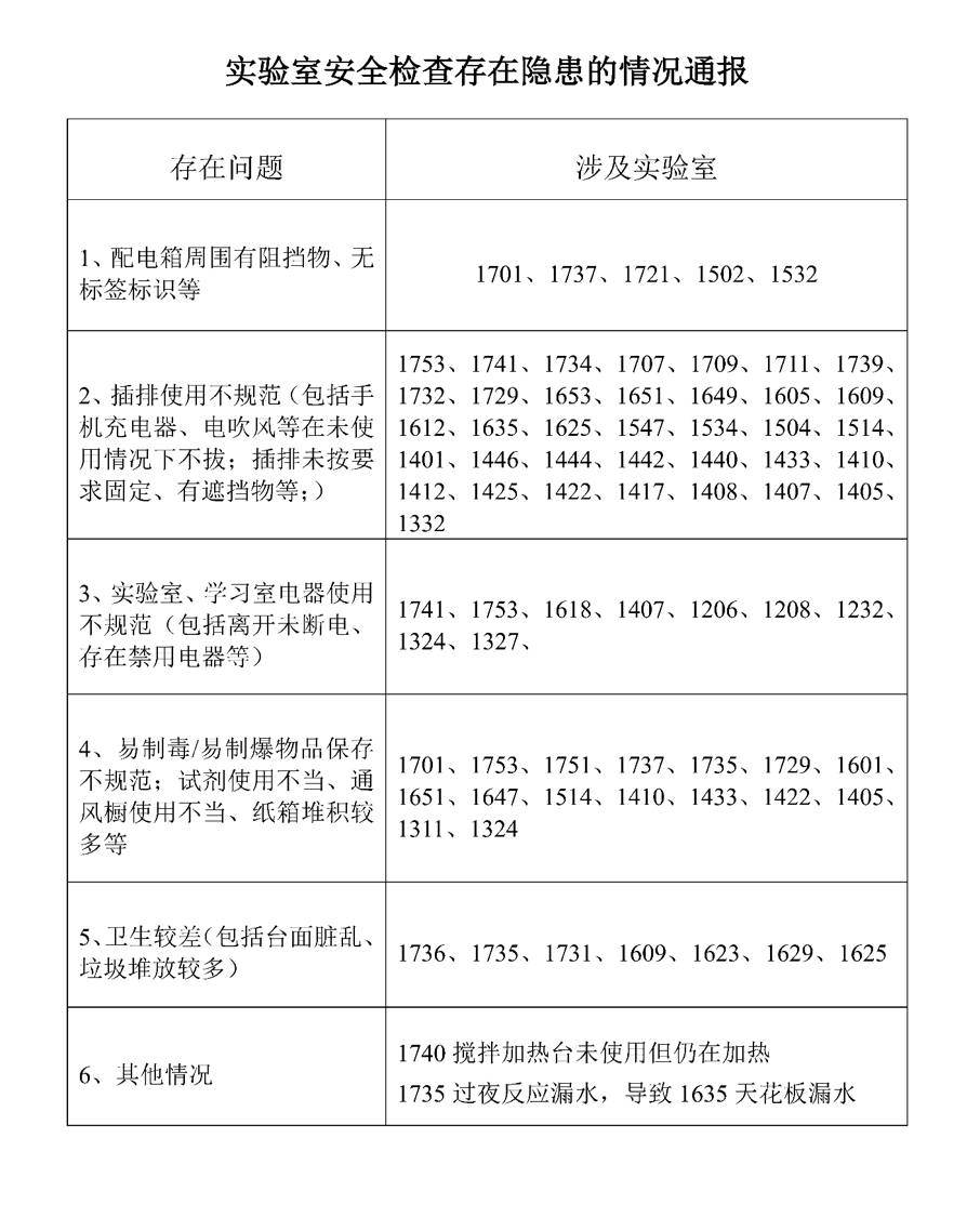 整体安全情况良好,但仍存在以下问题:1、部分实验室存在违规电器,如电暖气等;2、大部分实验室存在电源插座连接不规范、人走未断电等情况;3、部分实验室存在私拉电线、插座超负荷运行等情况;4、部分实验室台面较乱、杂物存放较多。希望通过本次实验室安全检查工作,十博