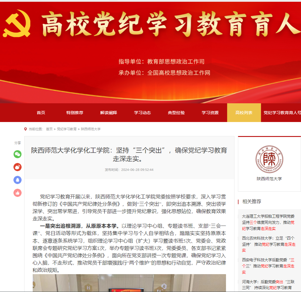 公众号开设《学党纪守初心》专栏,目前累计推送35篇学习内容。组组织领导干部、党支部书记和师生党员代表赴秦岭违建警示教育中心和红军过境户县陈列馆开展“深化警示教育 筑牢思想防线”党纪学习教育,进一步增强党员干部纪律意识和规矩意识。