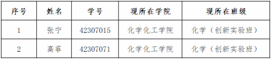 根据教务处《关于做好2023级“人文科学试验班”“理科试验班”中期考核及二次选拔工作的通知》和《十博(10bet)亚洲官方网站 2023级化学笃学班中期考核和二次选拔实施办法》,十博 对2023级化学笃学班二次选拔报名的同学进行了考核,现将结果予以公示,公示时间:2024年9月24日-9月26日。十博(10bet)亚洲官方网站 2名学生通过考核,结果如下(按照学号顺序排序):