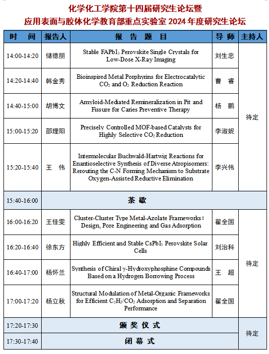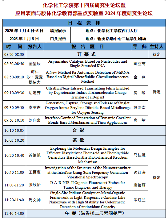 第十四届研究生论坛暨应用表面与胶体化学教育部重点实验室2024年度研究生论坛,诚挚邀请十博