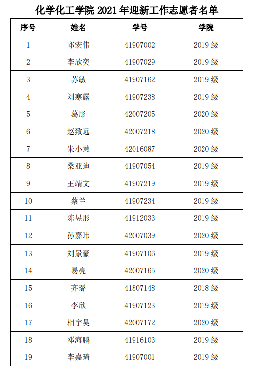 根据《关于招募十博(10bet)亚洲官方网站 2021年迎新工作志愿者的通知》要求,按照十博(10bet)亚洲官方网站 2021年迎新志愿者招募条件,通过公开招募、自愿报名、择优录取,拟定邱宏伟等58名同学为活动志愿者,现予以公示。