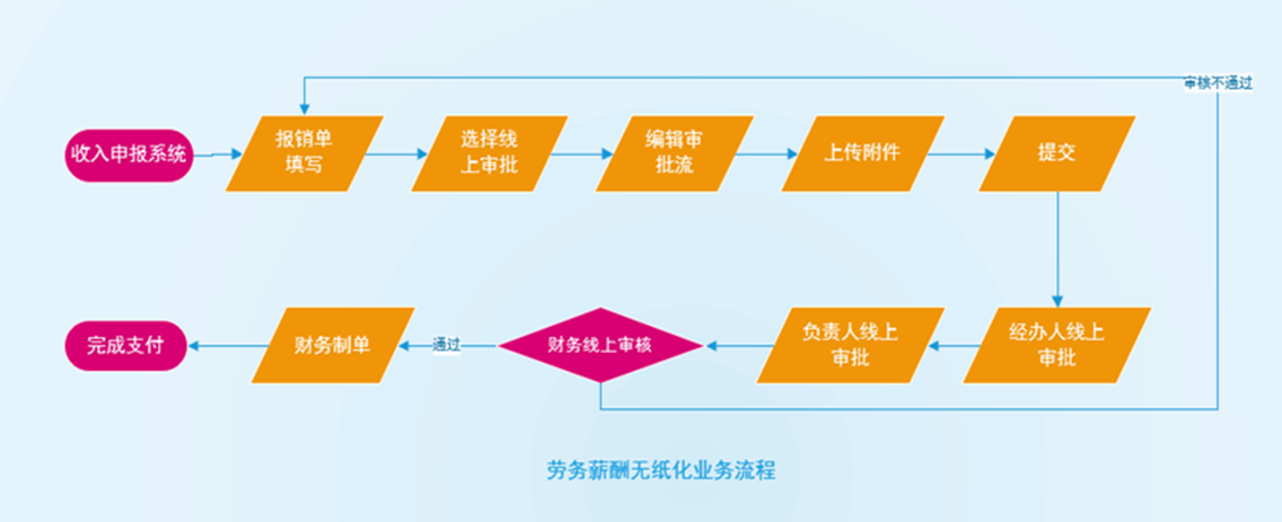经办人线上填写报销单,选择线上审批之后,编辑审批流程,点击提交进入审批环节。三个级次人员进行审批,包括经办人、项目负责人、财务审核人。财务审核人审核通过后,制单支付,若审核不通过返还至经办人进行修改,重新提交审批。