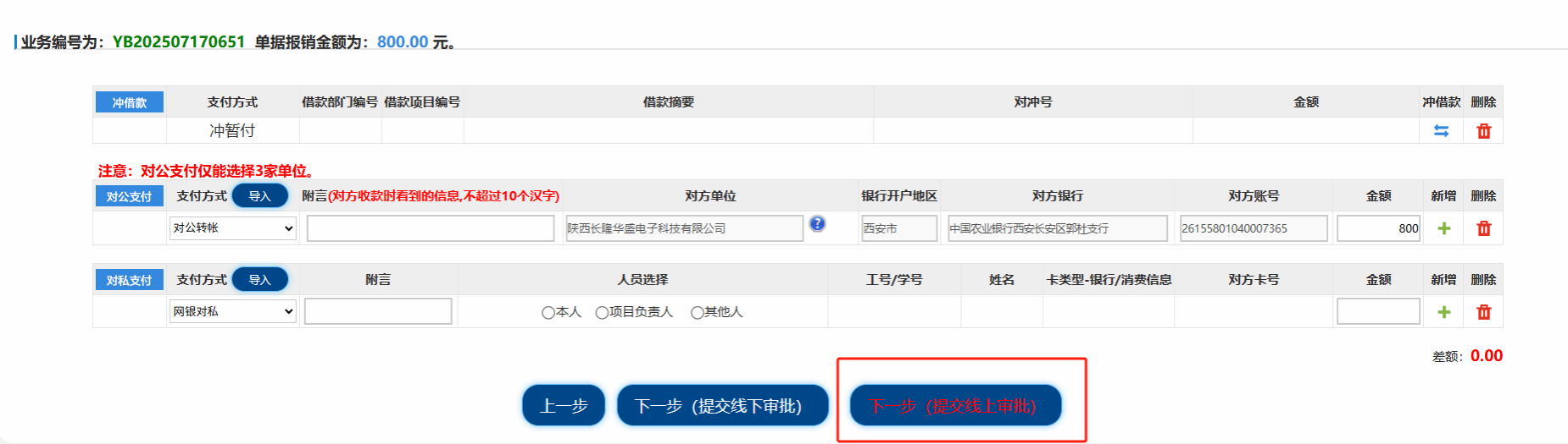 (6)提交单据。提交后,无需对单据进行打印,投递。各审批级次在线审批完成后,财务人员进行制单支付。