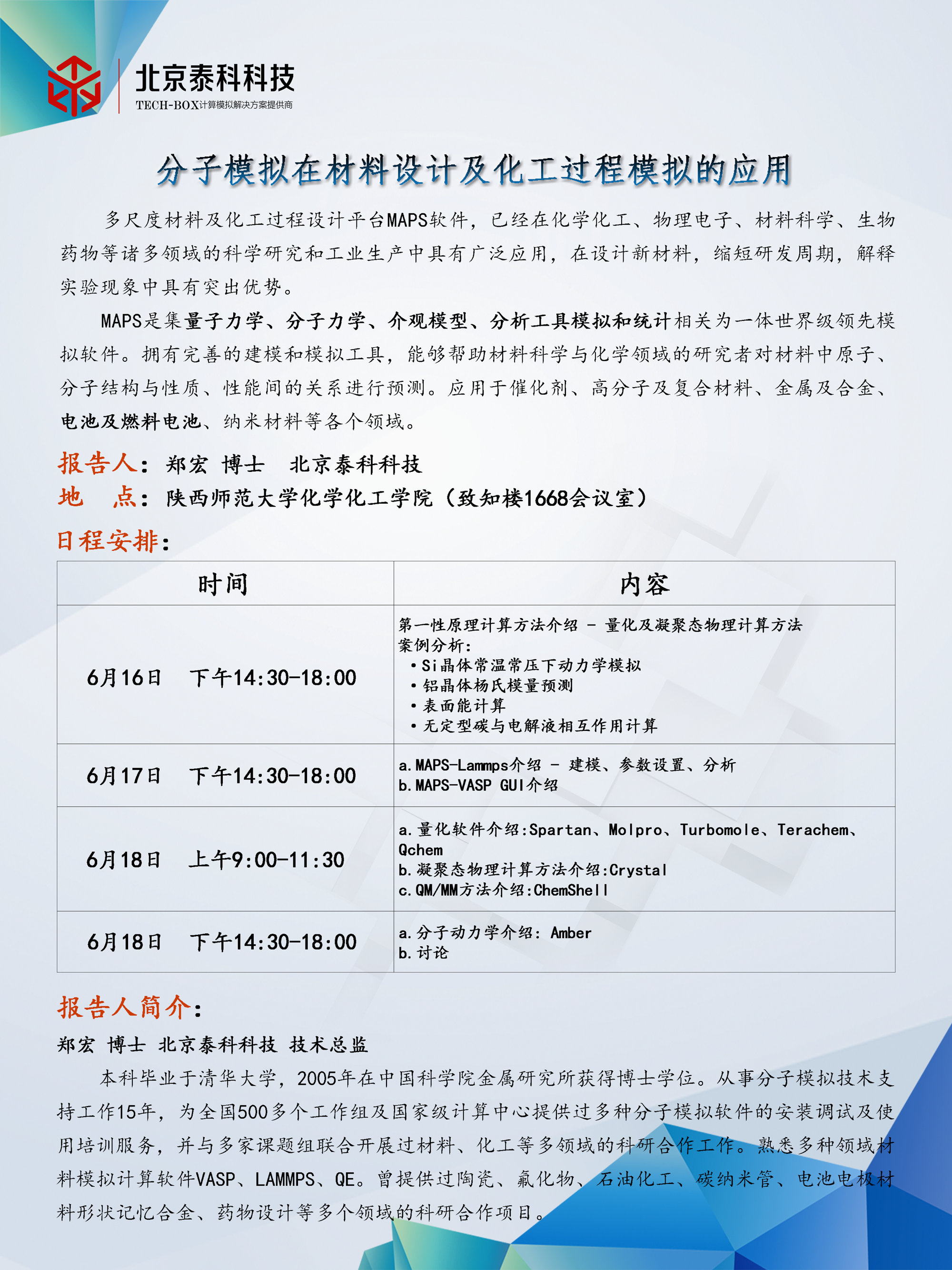 十博(10bet)亚洲官方网站 计算化学和分子模拟共享平台(1768室)已经通过学校的验收,现准备开放运行,定于下周(2020.6.16-2020.6.18)进行分子模拟方面的培训,具体安排见下表,欢迎各位老师和同学积极参加!