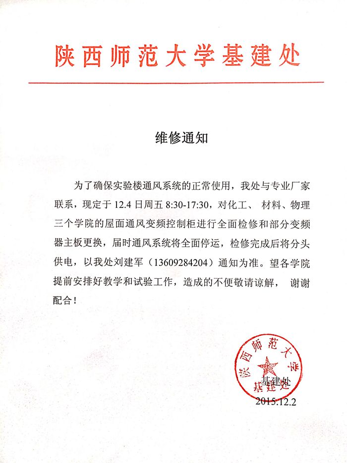 为了确保实验楼通风系统的正常使用,基建处定于12月4日(本周五)8:30-17:30,对十博(10bet)亚洲官方网站 屋面通风变频控制柜进行全面检修和部分变频器主板更换,届时通风系统将全面停运,检修完成后恢复供电。请各实验室提前安排好教学和实验工作,造成的不变敬请谅解,谢谢配合。