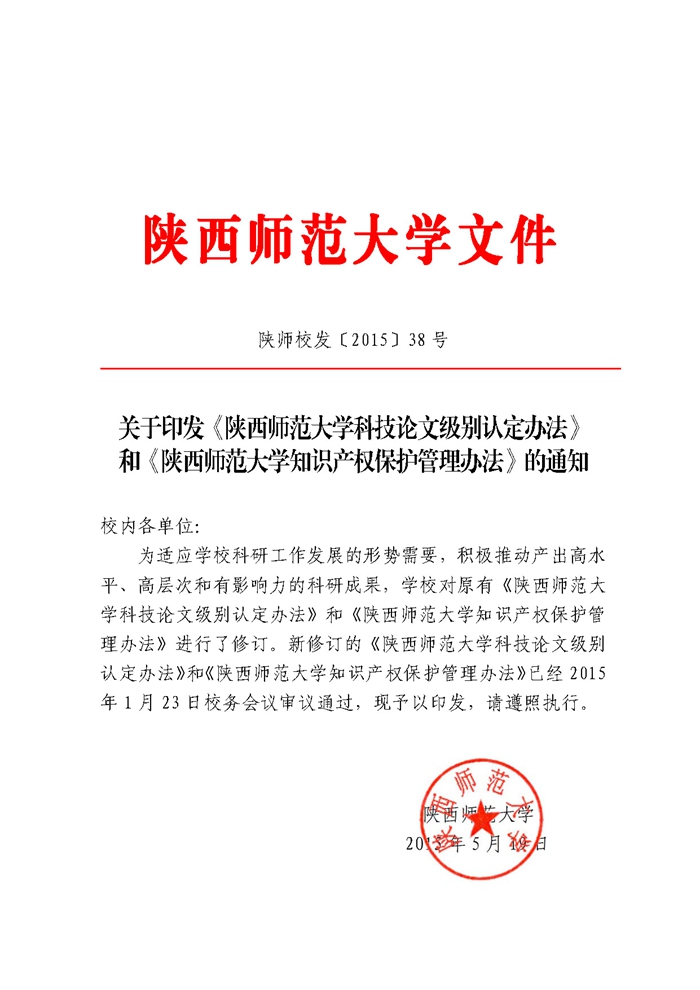 附件:《陕西师范大学科技论文级别认定办法》和《陕西师范大学知识产权保护管理办法》