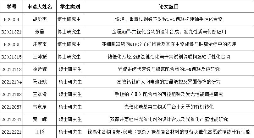 根据研究生院《关于推荐2024年优秀研究生学位论文的通知》,经个人申请、十博 审核、学位评定委员会化学分会审议,拟推荐胡盼杰等4名博士研究生,徐哲辉等6名硕士研究生学位论文为2024年校级优秀研究生学位论文(名单附后),现予以公示。