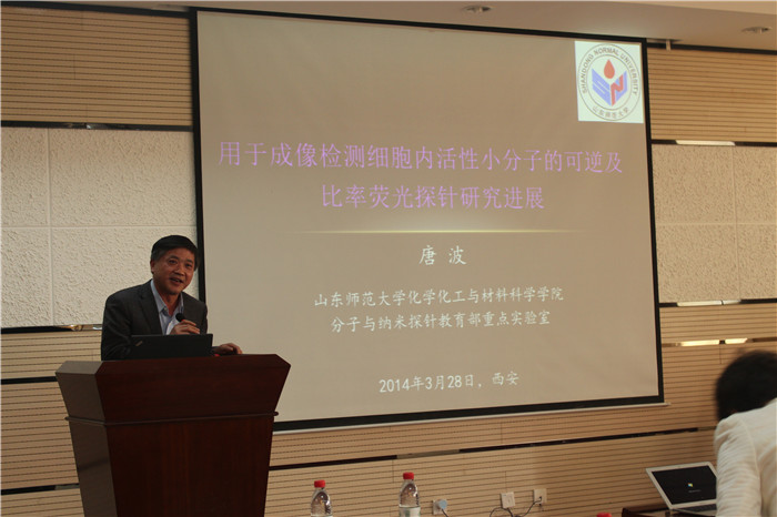 六层报告厅做了题为“用于成像检测细胞内活性小分子的可逆及比率荧光探针研究进展”的学术报告。唐波教授介绍了生物活性小分子的生物学功能及特点,展示了该研究组在荧光成像法、可逆荧光成像和比率荧光成像研究中取得的成果。